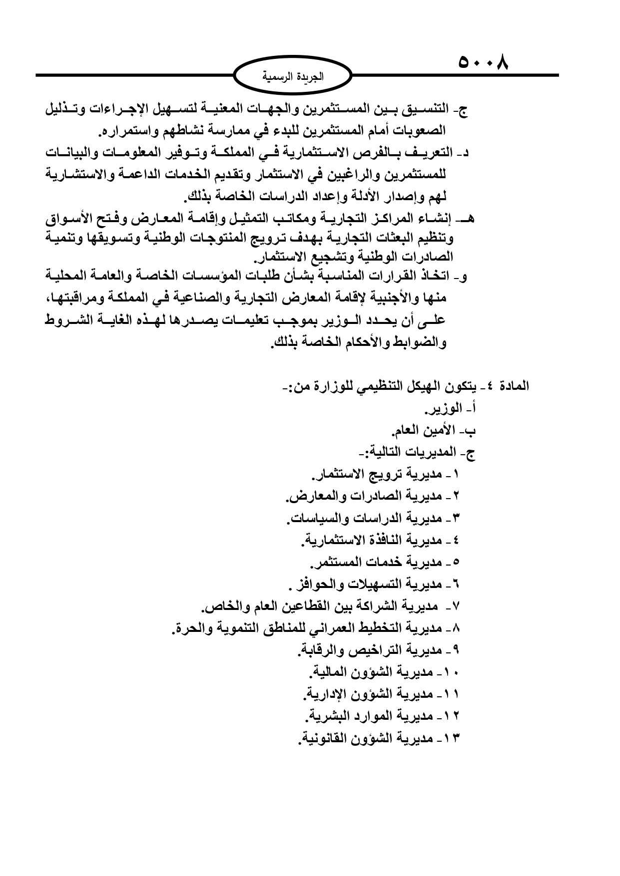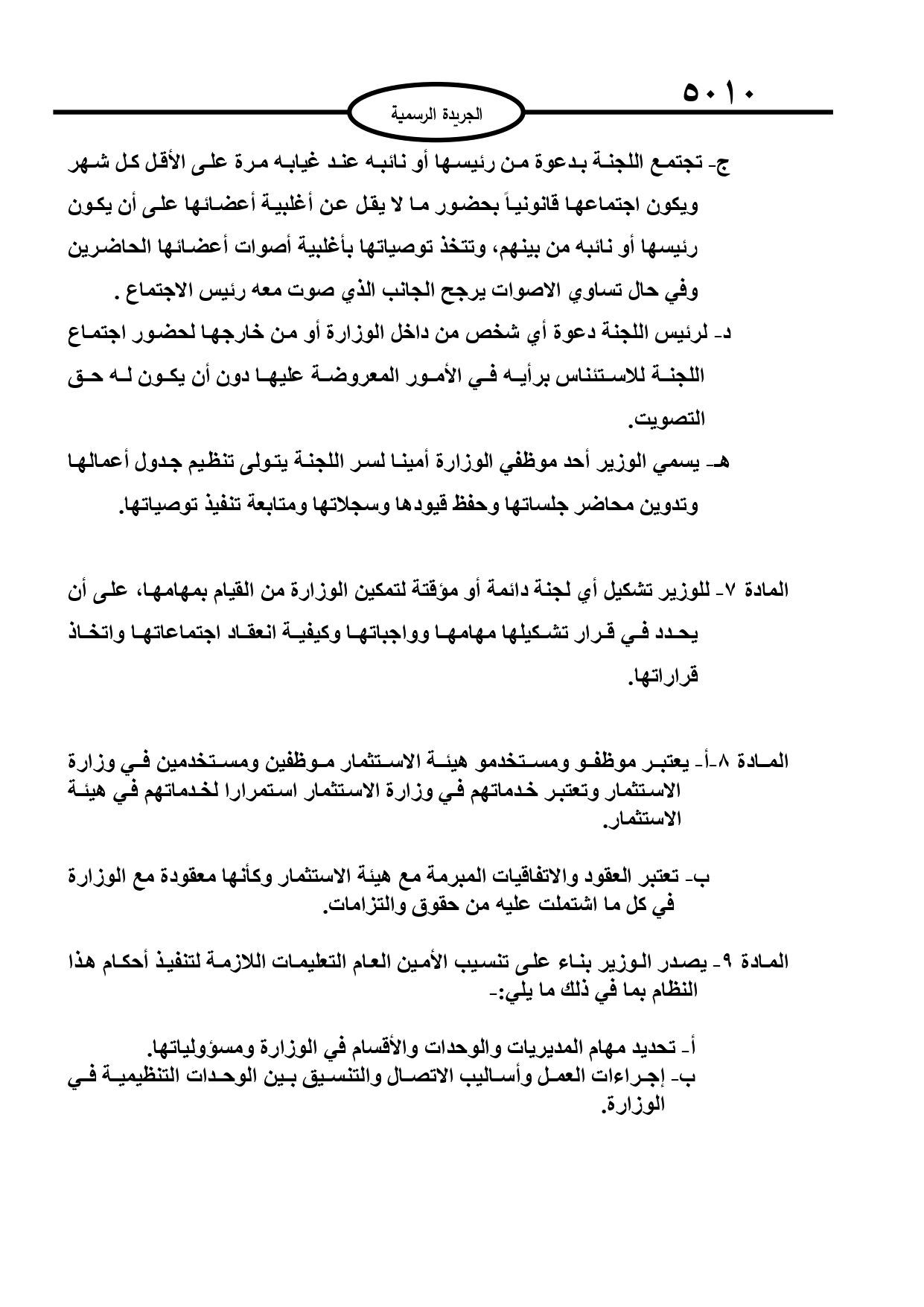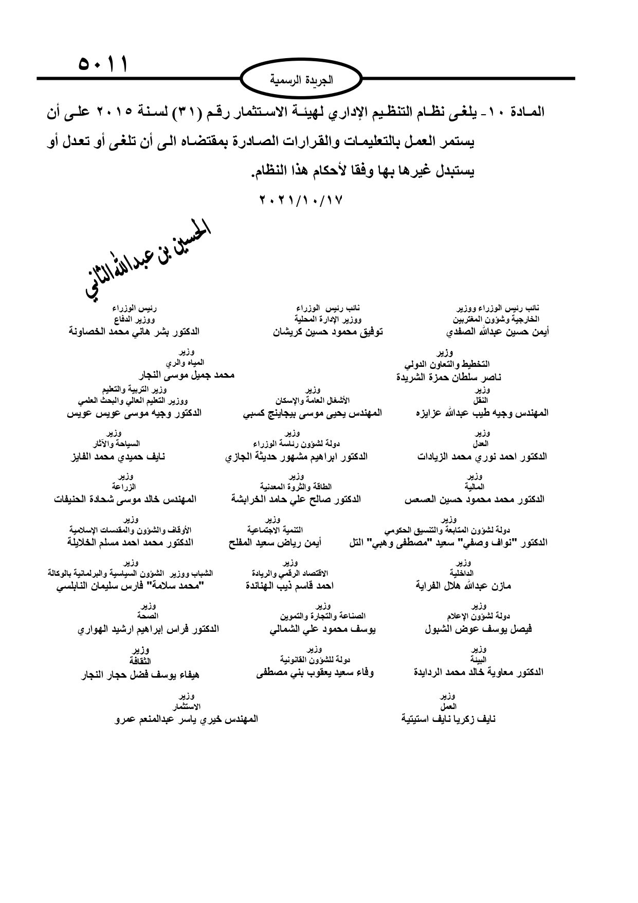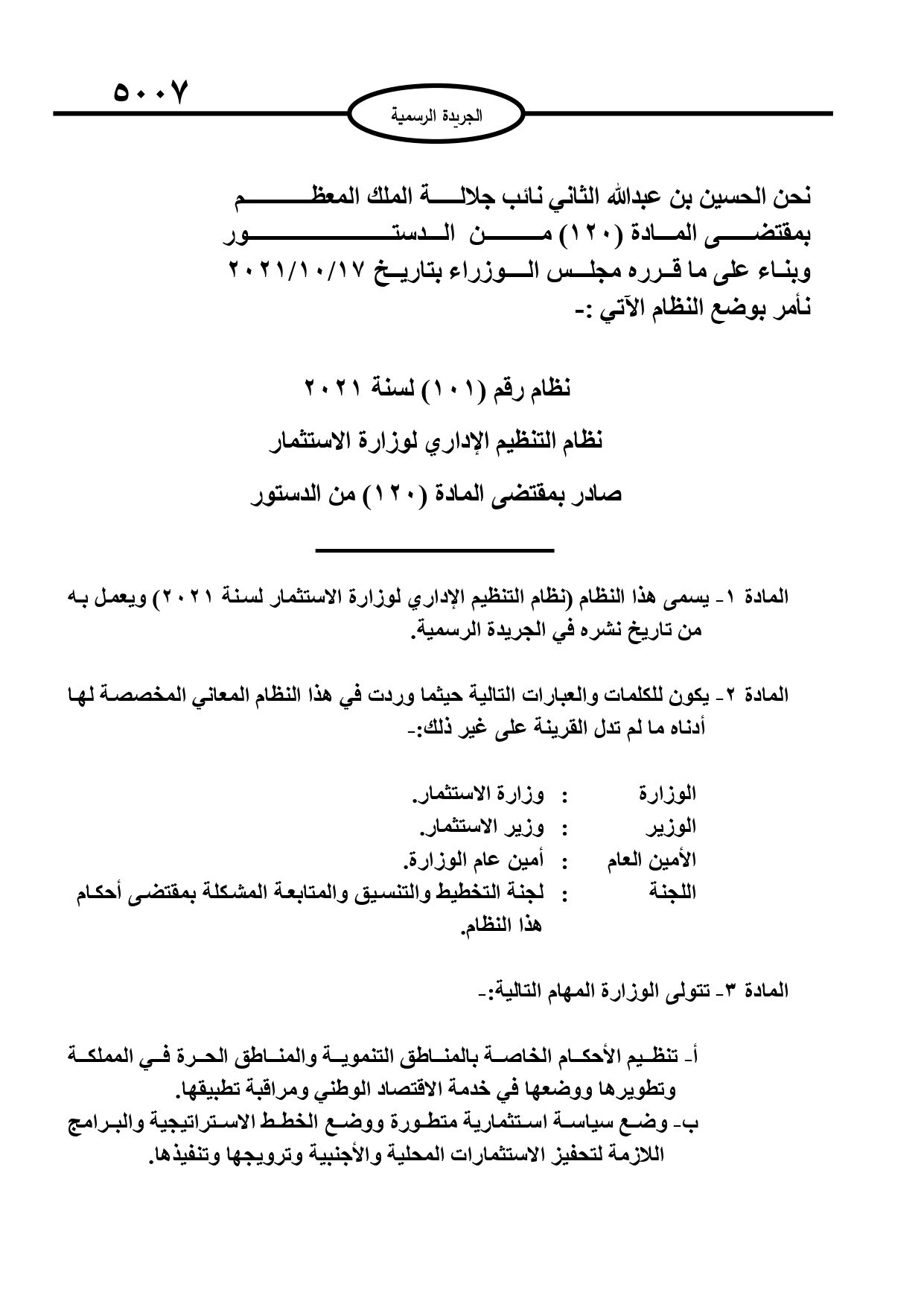 نبأ الأردن-صدر في عدد الجريدة الرسمية رقم (5756)، نظام التنظيم الإداري لوزارة الاستثمار.