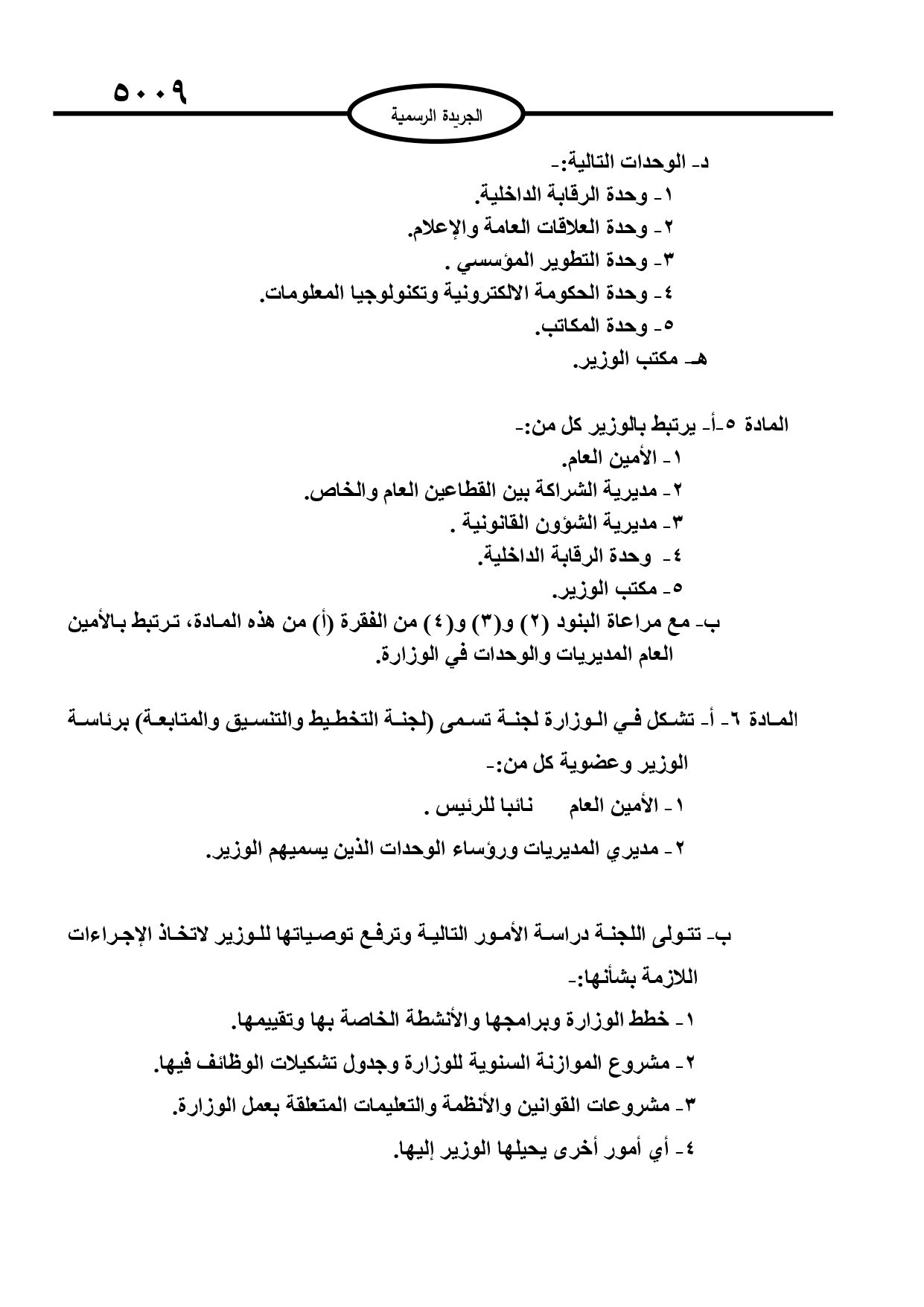 وتشكل لجنة في الوزارة الجديدة، تسمى لجنة التخطيط والتنسيق والمتابعة برئاسة الوزير وعضوية الأمين العام، ومديري المديريات ورؤساء الوحدات الذين يسميهم الوزير.