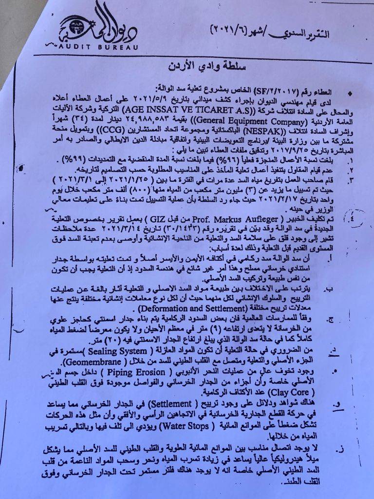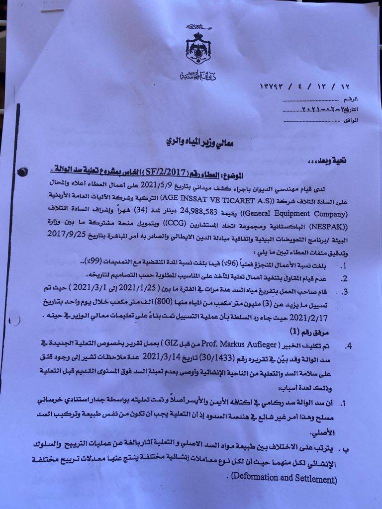 ملأت أخبار تفريغ جزءا من سد الوالة الإعلام الرسمي والرقمي في شباط 2021، دونما معرفة السبب الحقيقي والذي تم الإشارة له بكلمة "ضرورات" أو "اجراءات احترازية". ربما لم يستطع الوزير د. السعيدان وقتها الافصاح أكثر بسبب ضغوط أو حساسية المرحلة، وفوق ذلك بدل ما يتم تكريمه هو وباقي فريق العمل الكبير من الأردنيين من الجهات المعنية، تعرض لحملة تشويه صارخة وممنهجة بحجة أنه أختلف مع المديريات، علما ان الخلاف كان على وقت التفريغ وليس قرار التفريغ (مراسلات مرفقة) وانه أهدر حوالي مليون متر مكعب من مياه السد، في محاولة للتعتيم عن أولا: مدى مطابقة تصميم وتنفيذ مشروع تعلية سد الوالة مع المواصفات، وثانيا للتغطية على سوء إدارة السدود من قبل الجهة المعنية.