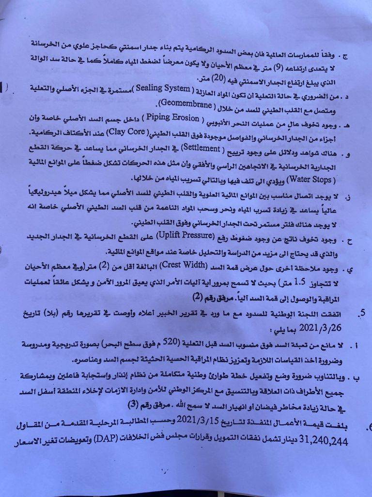 •عدم تنفيذ توصيات اللجنة الوطنية للسدود التي جاءت بناء على رأي الخبير الفني وفقاً لمبادئ إدارة المخاطر.