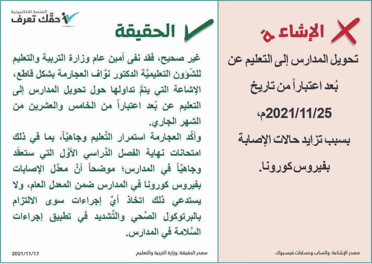 #عاجل|حقك تعرف: لا صحَّة لتحويل المدارس إلى التَّعليم عن بُعد اعتباراً من 25-11