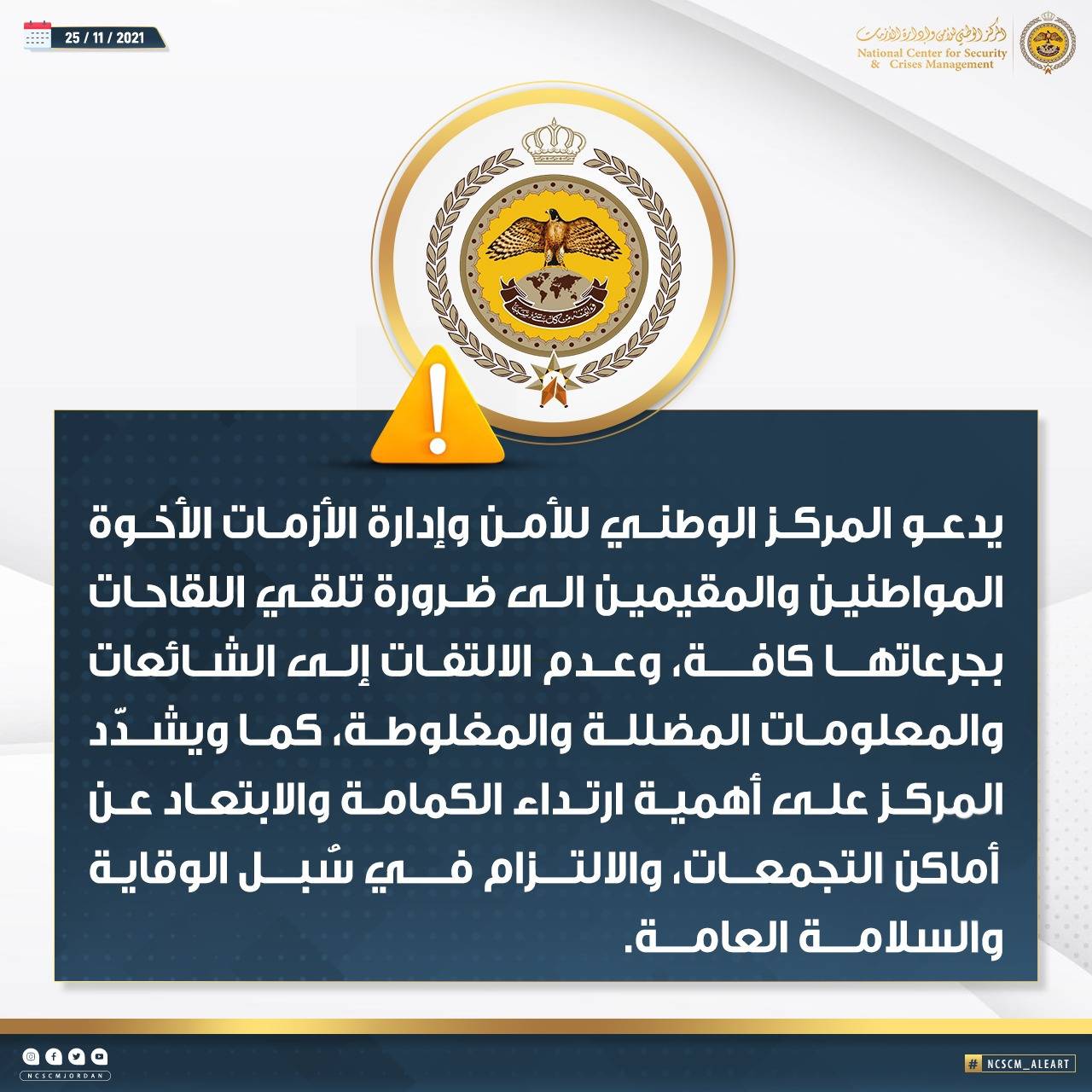 نبأ الأردن- يدعو المركز الوطني للأمن وإدارة الأزمات الأخوة المواطنين والمقيمين الى ضرورة تلقي اللقاحات بجرعاتها كافة، وعدم الالتفات إلى الشائعات والمعلومات المضللة والمغلوطة، كما ويشدّد المركز على أهمية ارتداء الكمامة والابتعاد عن أمكان التجمعات، والالتزام في سُبل الوقاية والسلامة العامة.