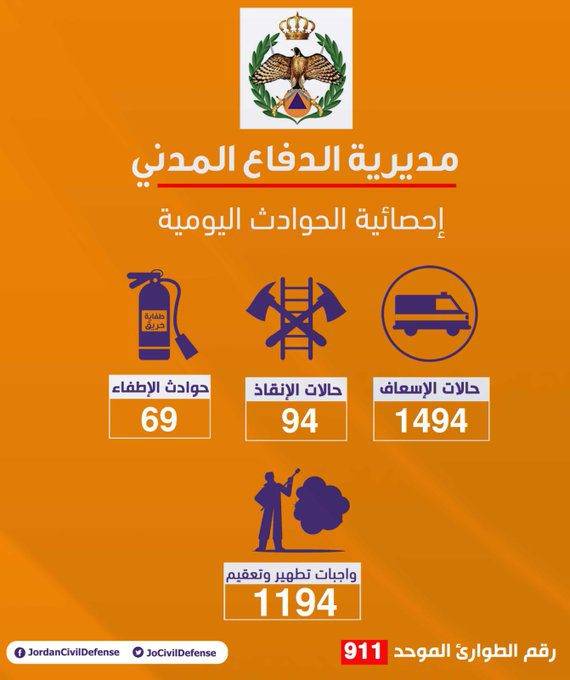 نبأ الأردن- تعاملت مديرية الدفاع المدني خلال 24 ساعة الماضية مع(١٤٩٤) حالة إسعافية مختلفة، حيث تم إجراء اللازم لهم وتأمين وصولهم إلى المستشفيات.