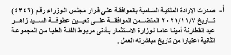نبأ الأردن- صدرت الارادة الملكية السامية ، بالموافقة على قرار مجلس الوزراء المتضمن تعيين زاهر القطارنة أميناً عامّاً لوزارة الاستثمار، وفقا لما جاء الجريدة الرسمية.