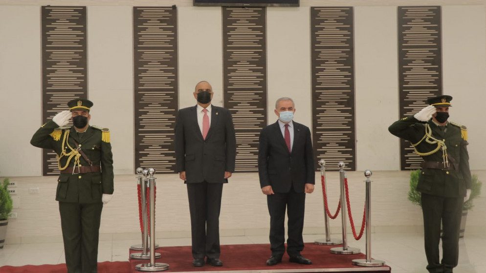 وجرى لرئيس الوزراء استقبال رسمي لدى وصوله رام الله، حيث كان في استقباله رئيس الوزراء الفلسطيني وعدد من الوزراء والمسؤولين، وعزفت موسيقى السلام الملكي الأردني والنشيد الوطني الفلسطيني، واستعرض الخصاونة حرس الشرف الذي اصطف لتحيته.