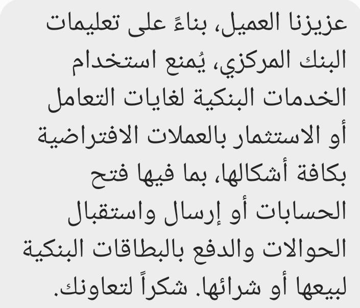 يأتي ذلك بناءً على تعليمات البنك المركزي التي تمنع أيضاً فتح الحسابات أو إرسال أو استقبال الحوالات أو الدفع بالبطاقات البنكية لبيعها أو شرائها.
