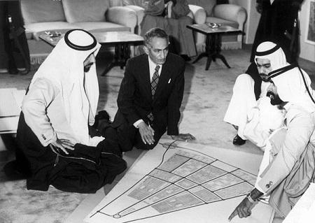 وخطط الدكتور مخلوف المهندس المعماري، أثناء جلوسه على الأرض مع الشيخ زايد بن سلطان آل نهيان "طيب الله ثراه" الأب المؤسس، لمدينة أبوظبي في قصر البحر.