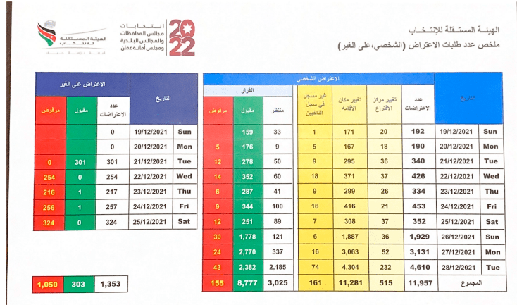 وكانت الهيئة المستقلة للانتخاب قد عرضت على موقعها الالكتروني وفي مقار لجان الانتخاب جداول الناخبين الاولية لانتخابات مجالس المحافظات والمجالس البلدية ومجلس أمانة عمان، وذلك استنادا لاحكام المادة (36) من قانون الادارة المحلية رقم 22 لسنة 2021، والمادة (6) من قانون أمانة عمان، رقم 18 لسنة 2021، حيث بلغ عدد الطلبات الشخصية ( 11957) طلبا.