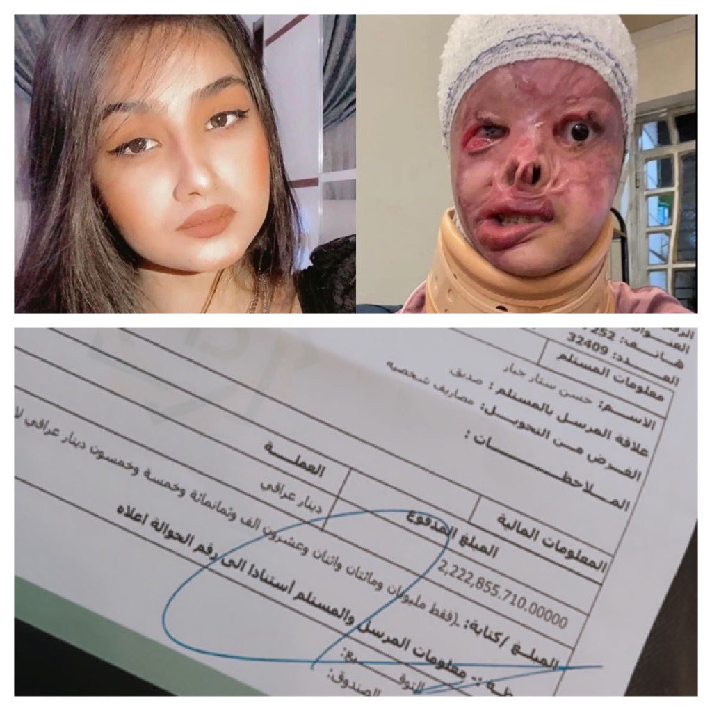 وعلى حسابها في "تويتر"، نشرت مي العيدان صور للفتاة مريم وصورة لوصل أموال، وقالت: "إلهام الفضالة تدفع للفتاة العراقية مريم الركابي مليونين و200 ألف دينار عراقي لعلاجها وعملياتها.. أهل العراق، هذا المبلغ كم قيمته بالدولار لو سمحتو، ولا هنتو؟"