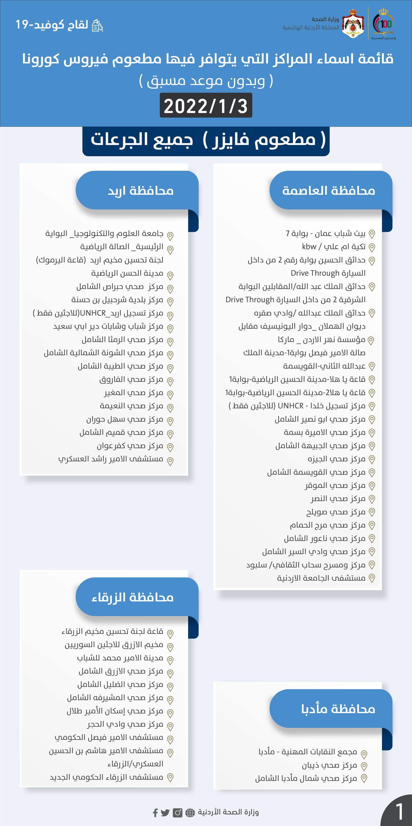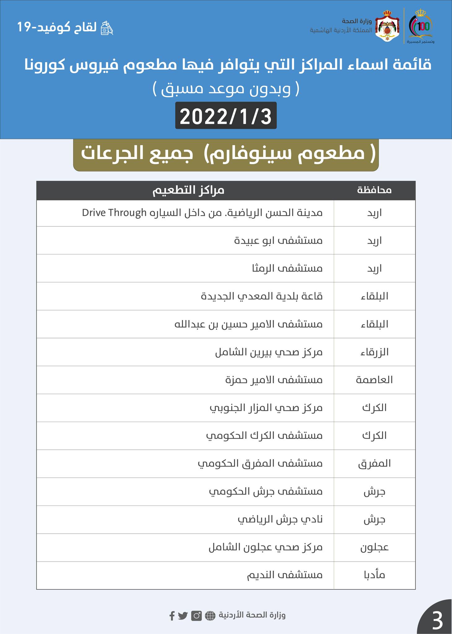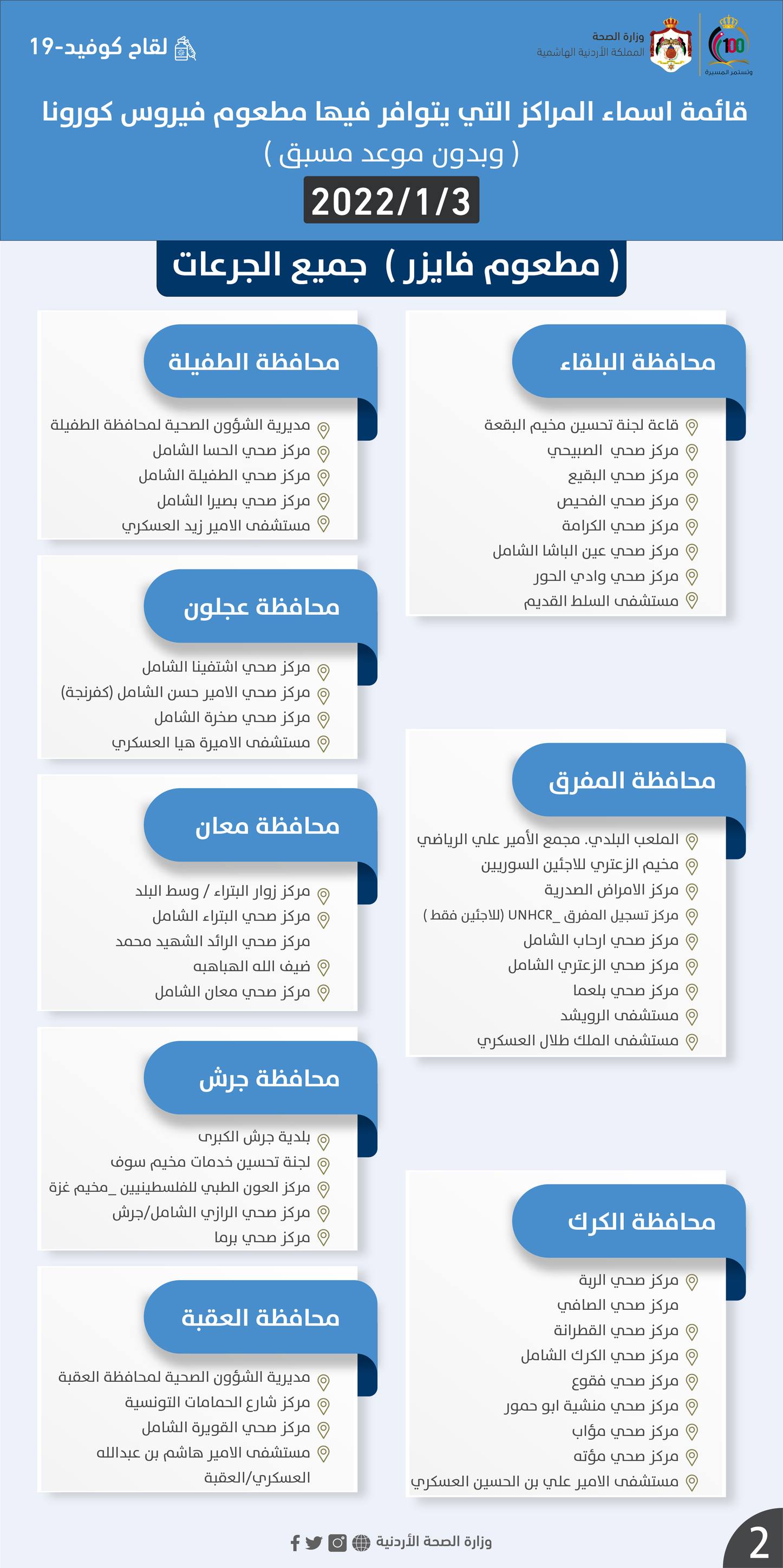 وستقدم المراكز المشمولة لقاحي فايزر وسينوفارم وفق المرفقات التالية التالي: