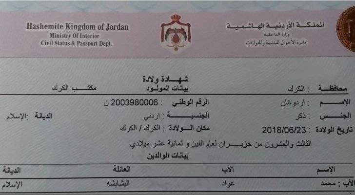 نبأ الأردن- اطلق مواطن اردني من محافظة الكرك ، اسم " أردوغان" على ابنه.