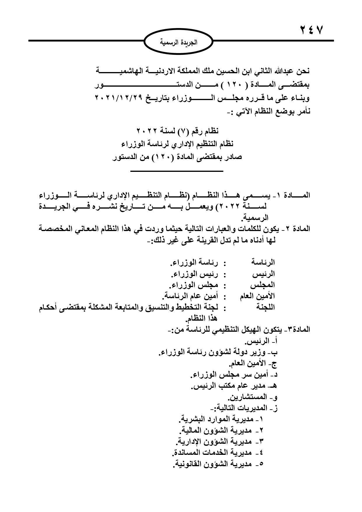 نبأ الأردن- صدر في الجريدة الرسمية، اليوم الأربعاء، نظام التنظيم الإداري لرئاسة الوزراء لسنة 2022.