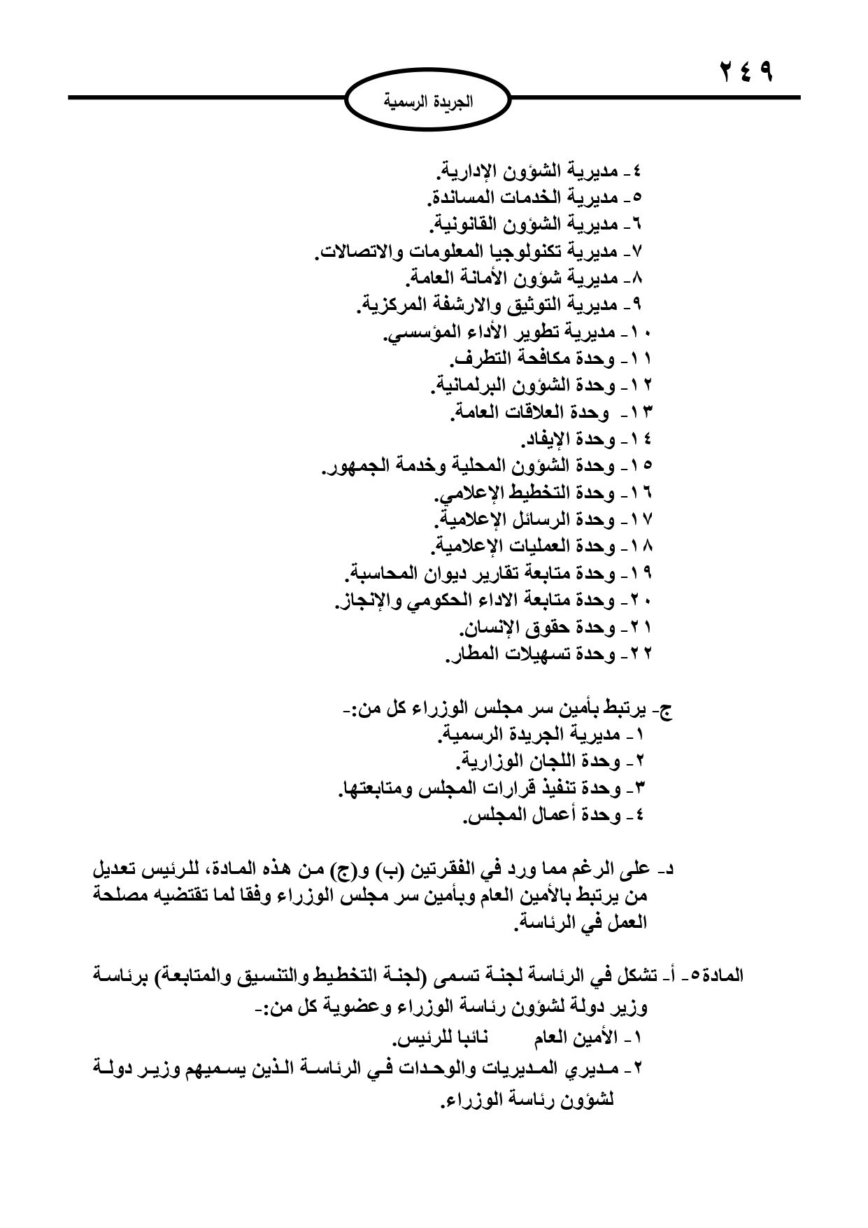 وتتشكل بموجب النظام، لجنة في الرئاسة تسمى لجنة التخطيط والتنسيق والمتابعة برئاسة وزير الدولة لشؤون رئاسة الوزراء وعضوية؛ الأمين العام نائبا للرئيس، ومديري المديريات والوحدات في الرئاسة الذين يسميهم وزير الدولة لشؤون رئاسة الوزراء.