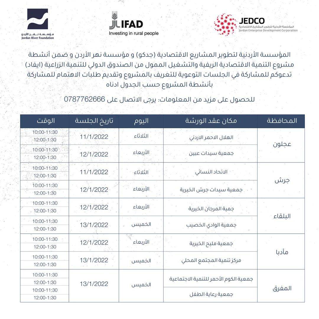 نبأ الأردن- المؤسسة الأردنية لتطوير المشاريع الاقتصادية ومؤسسة نهر الأردن يوجهون دعوة للمجتمع المحلي في المحافظات للاطلاع على برامج الاستفادة من مشروع التنمية الريفية.
