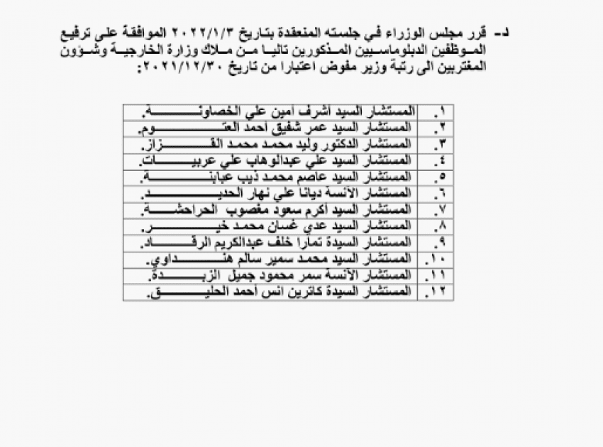 نبأ الأردن- صدر في عدد الجريدة الرسمية ، الاحد ، الموافقة على ترفيع دبلوماسيين في وزارة الخارجية وشؤون المغتربين إلى رتبة وزير مفوض اعتبارا من تاريخ 30-12-2021.