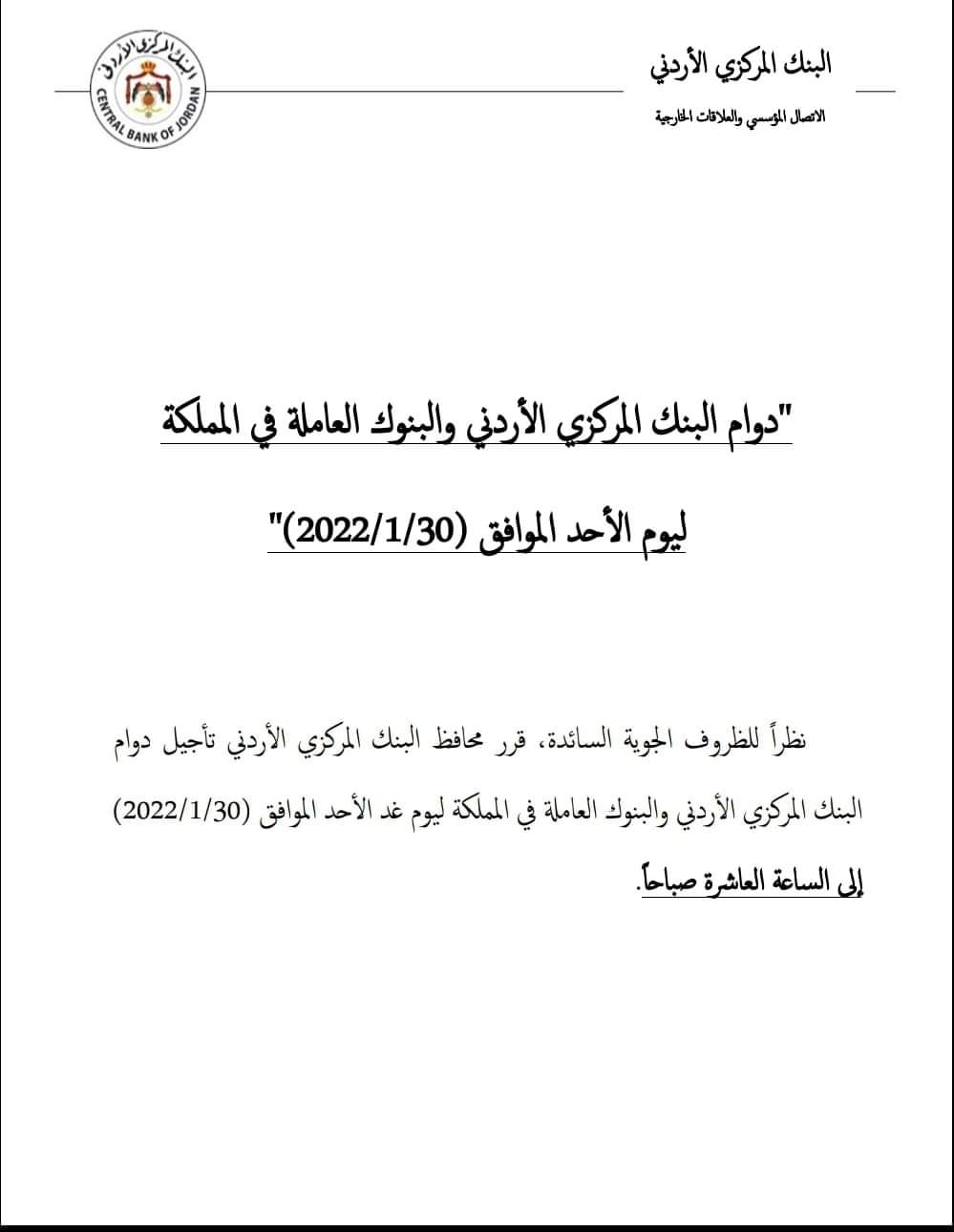 نظرا للظروف الجوية السائدة قرر محافظ البنك المركزي الأردني الدكتور عادل شركس تأخير دوام البنك المركزي الأردني والبنوك العاملة في المملكة ليوم غد الاحد ٣٠-١-٢٠٢٢ الى الساعة العاشرة صباحا