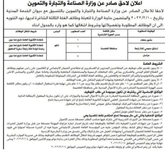 عاجل - وظائف شاغرة في وزارة الصناعة والتجارة وشركة حكومية (تفاصيل)