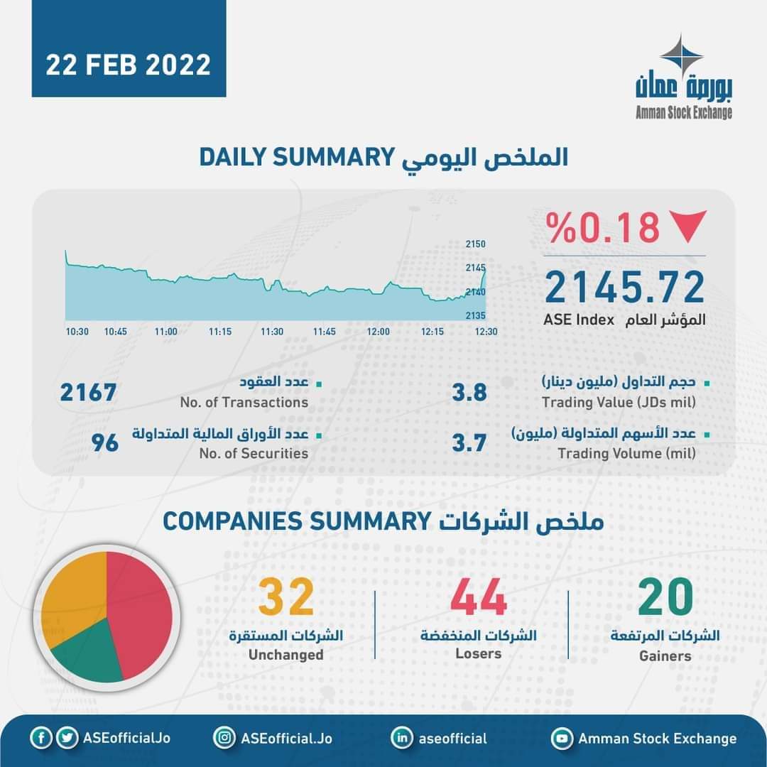 نبأ الأردن - بلغ حجم التداول الإجمالي ليوم الثلاثاء 22/02/2022 حوالي (3.8) مليون دينار وعدد الأسهم المتداولة (3.7) مليون سهم، نفذت من خلال (2,167) عقداً.