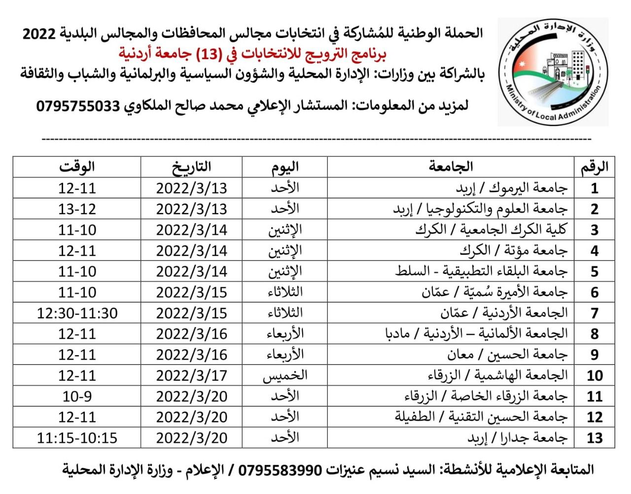 عمّان / تبدأ وزارة الإدارة المحلية يوم الأحد القادم سلسلة جديدة من اللقاءات الحوارية مع الطلبة في عدد من الجامعات الأردنية، وذلك بالتعاون مع وزارات الشؤون السياسية والبرلمانية والشباب والتعليم العالي والثقافة ضمن الحملة الوطنية للترويج للمشاركة في انتخابات مجالس المحافظات والمجالس البلدية التي ستجري في الثاني والعشرين من شهر آذار الجاري.