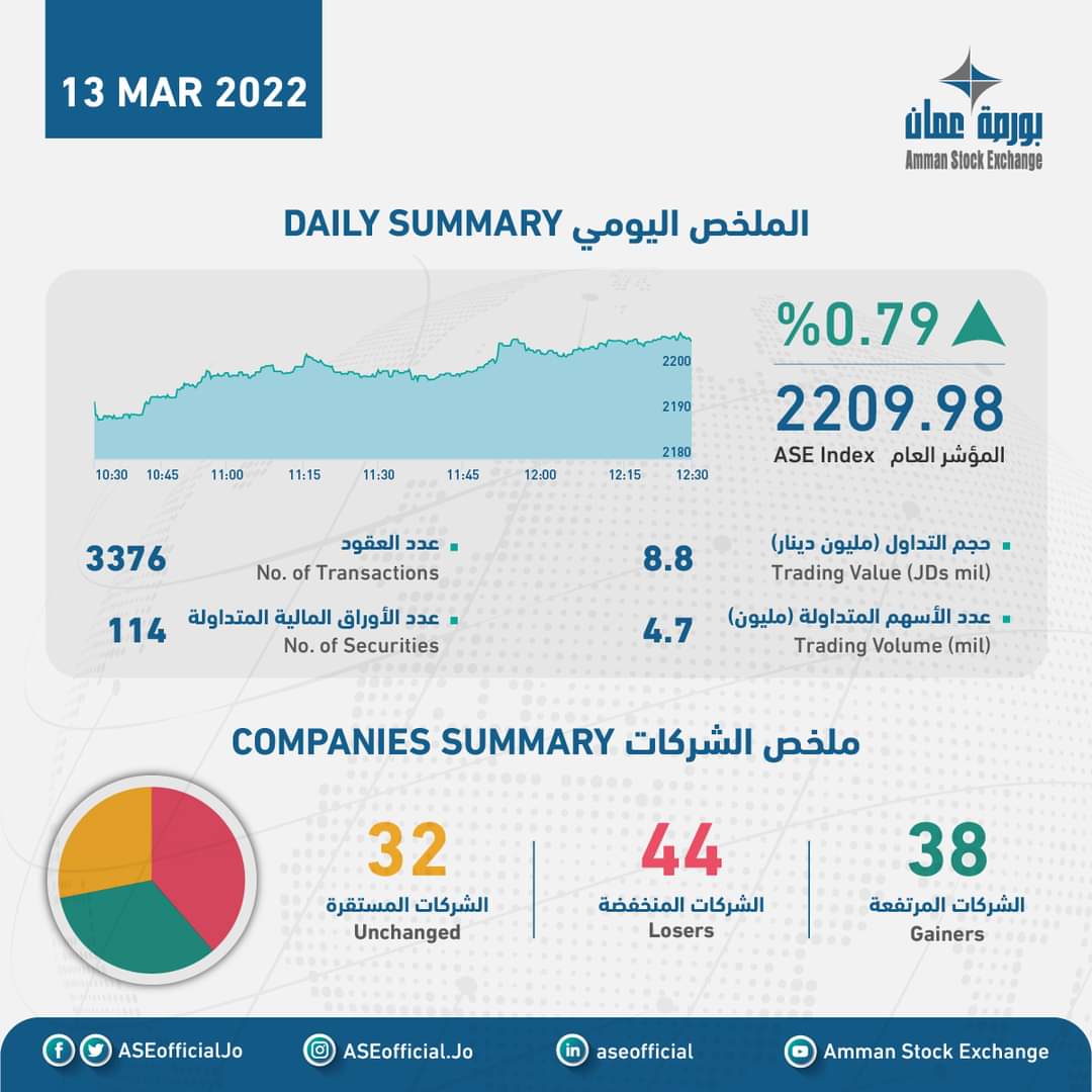 نبأ الأردن - بلغ حجم التداول الإجمالي ليوم الأحد 13/03/2022 حوالي (8.8) مليون دينار وعدد الأسهم المتداولة (4.7) مليون سهم، نفذت من خلال (3,376) عقداً.