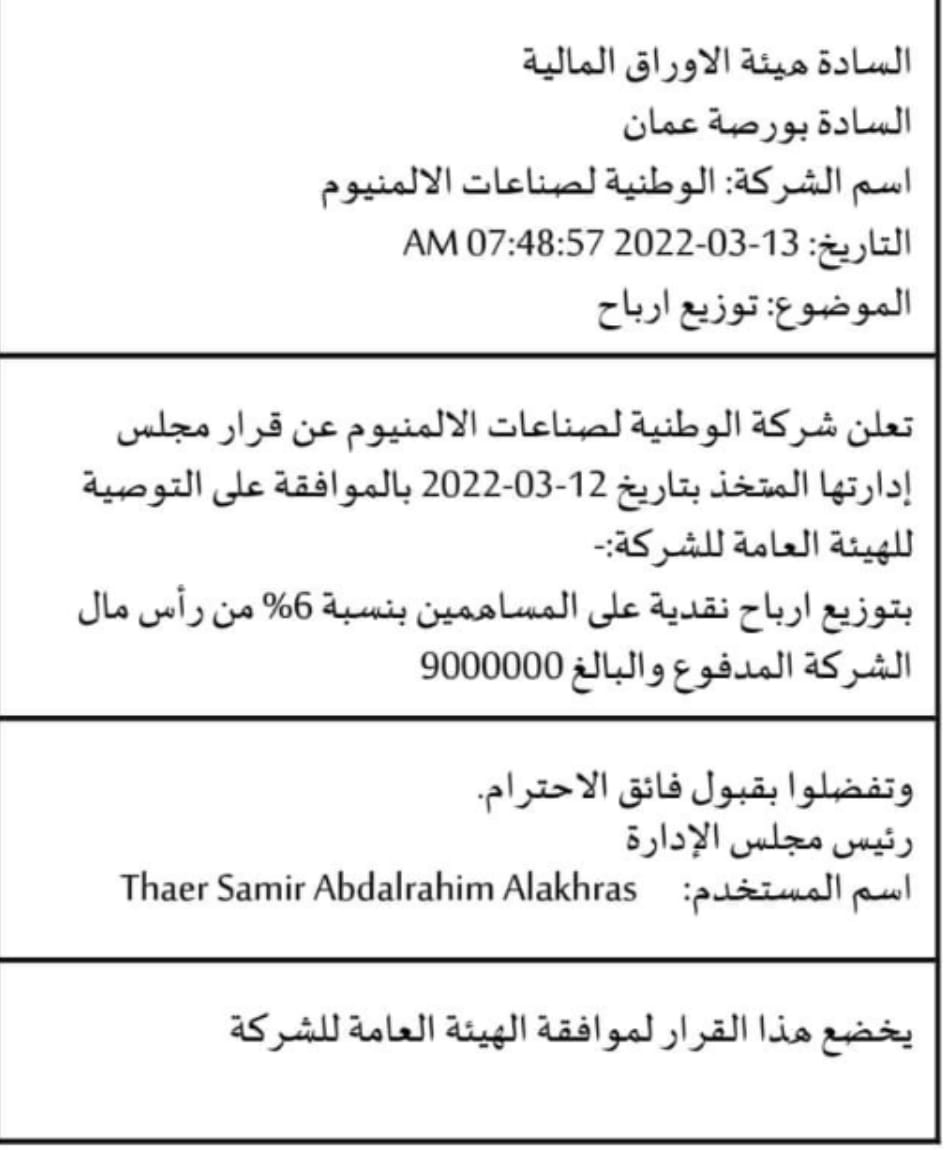 "الوطنية لصناعة الالمنيوم" تقرر توزيع أرباح نقدية بنسبة 6% من رأس المال