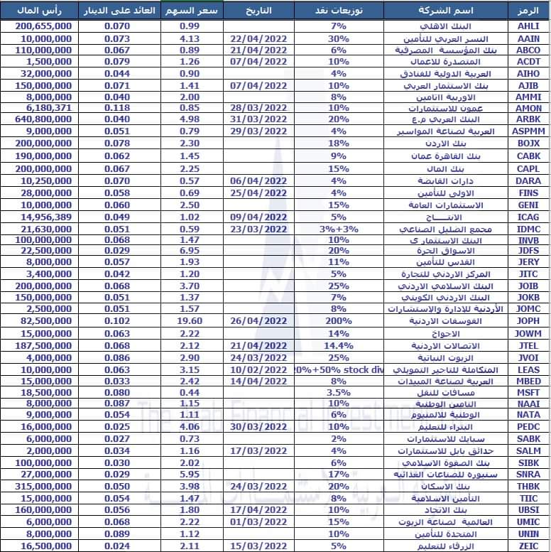 وبحسب وثيقة صادرة عن سوق عمان المالي في إفصاح إلى هيئة الأوراق المالية – بورصة عمّان، انه تقرر توزيع الارباح على النحوالتالي.