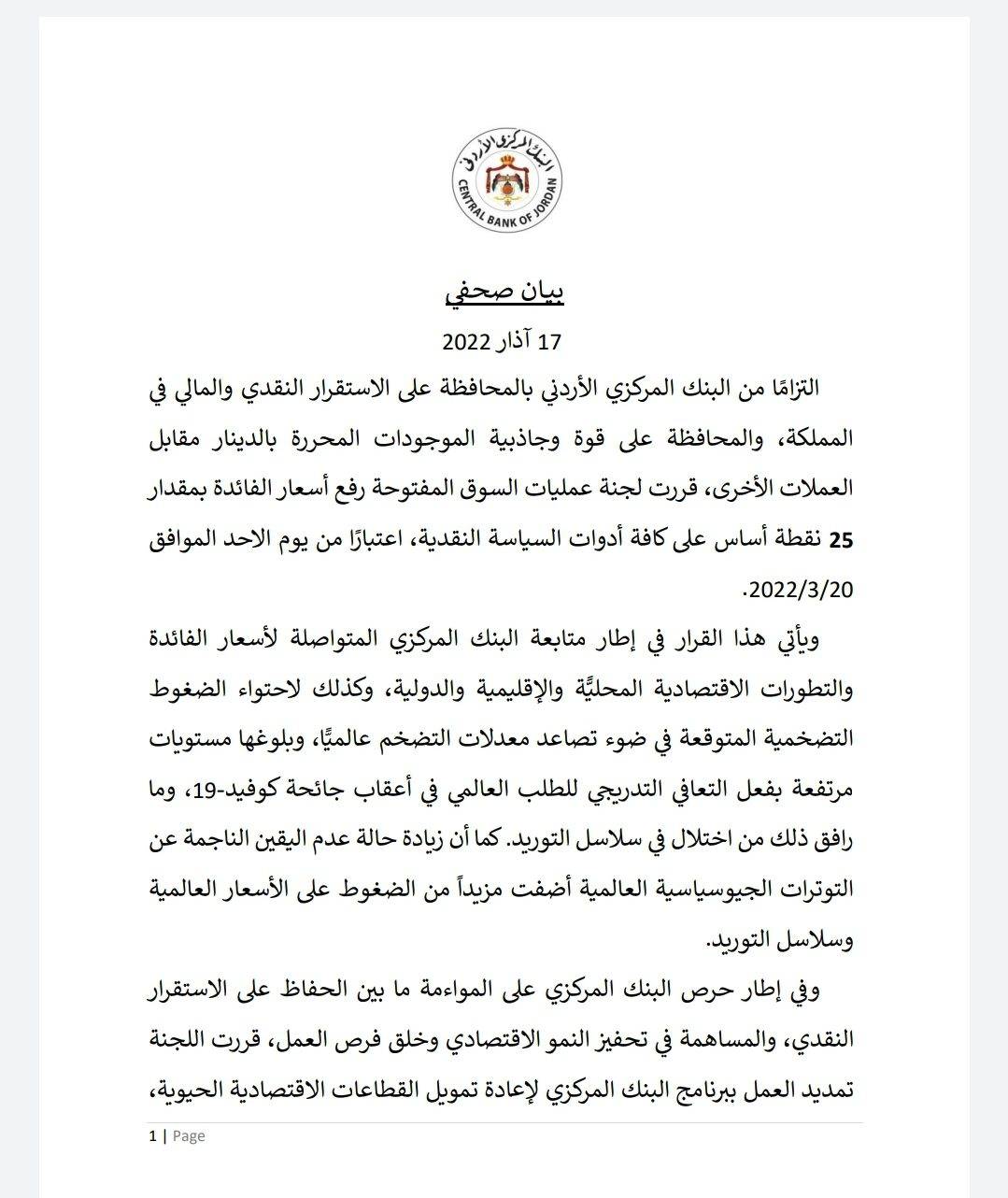نبا الأردن - كما انفرد موقع نبأ الأردن الإخباري بالأمس، وبعد قرار البنك الفدرالي الاميركي برفع أسعار الفائدة، فقد قررت لجنة عمليات السوق المفتوحة في البنك المركزي رفع أسعار الفائدة بمقدار 25 نقطة أساس على أدوات السياسة النقدية كافة، اعتباراً من يوم الأحد الموافق 20/3/2022.