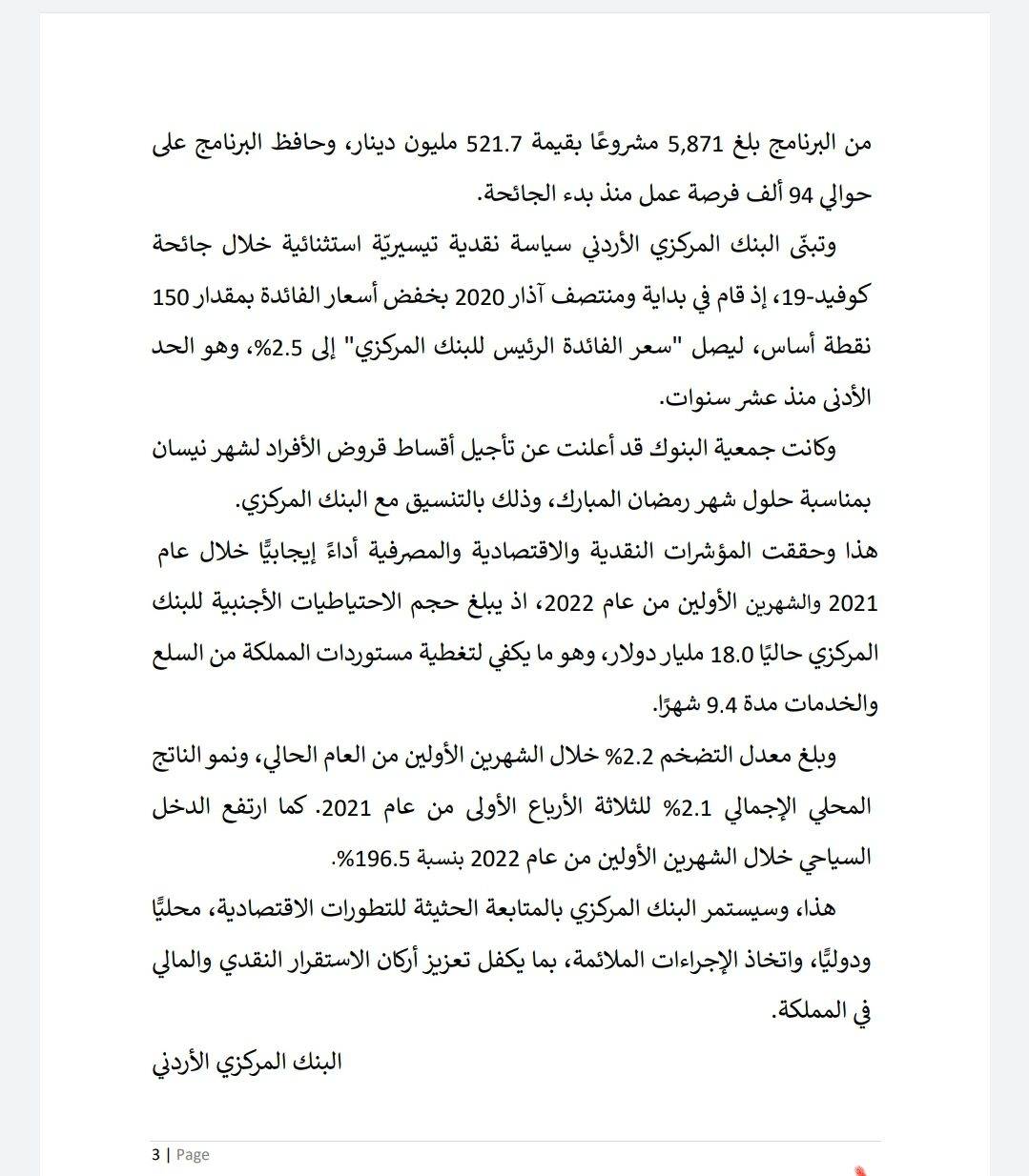 وحققت المؤشرات النقدية والاقتصادية والمصرفية أداء إيجابيّاً خلال العام 2021 والشهرين الأولين من العام الحالي (2022)، اذ يبلغ حجم الاحتياطيات الأجنبية للبنك المركزي حالياً 18.0 مليار دولار، وهو ما يكفي لتغطية مستوردات المملكة من السلع والخدمات مدة 9.4 شهر.