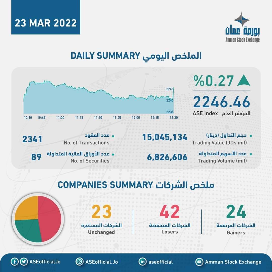 نبأ الأردن - بلغ حجم التداول الإجمالي ليوم الأربعاء 23/03/2022 حوالي (15.0) مليون دينار وعدد الأسهم المتداولة (6.8) مليون سهم، نفذت من خلال (2,341) عقداً.