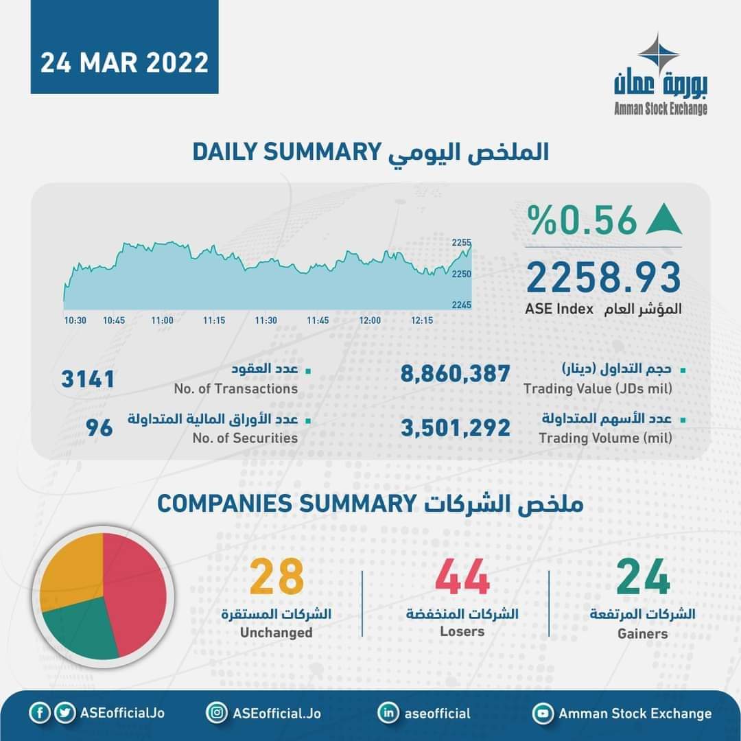 نبأ الأردن - بلغ حجم التداول الإجمالي ليوم الخميس 24/03/2022 حوالي (8.9) مليون دينار وعدد الأسهم المتداولة (3.5) مليون سهم، نفذت من خلال (3,138) عقداً.