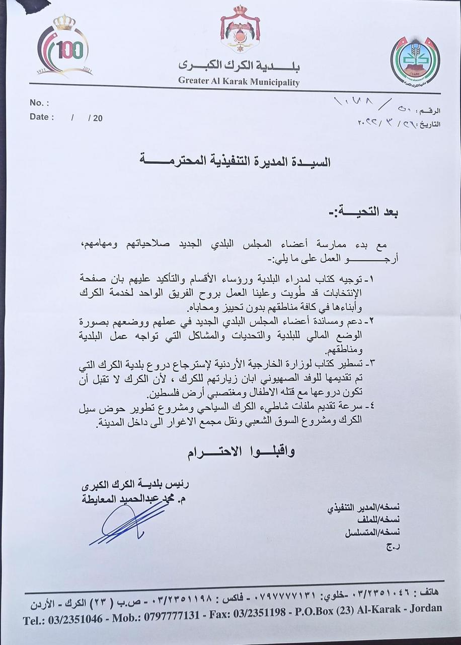 قرر مجلس بلدية محافظة الكرك بجلسته الاولى برئاسة رئيس البلدية الدكتور محمد عبد الحميد المعايطة، مخاطبة وزارة الخارجية وشؤون المغتربين، المغتربين لاسترجاع دروع بلدية الكرك التي تم تقديمها للوفد الصهيوني ابان زيارتهم للكرك،معللاً ذلك ان الكرك لاتقبل ان تكون دروعها مع قتلة الاطفال ومغتصبي ارض فلسطين.