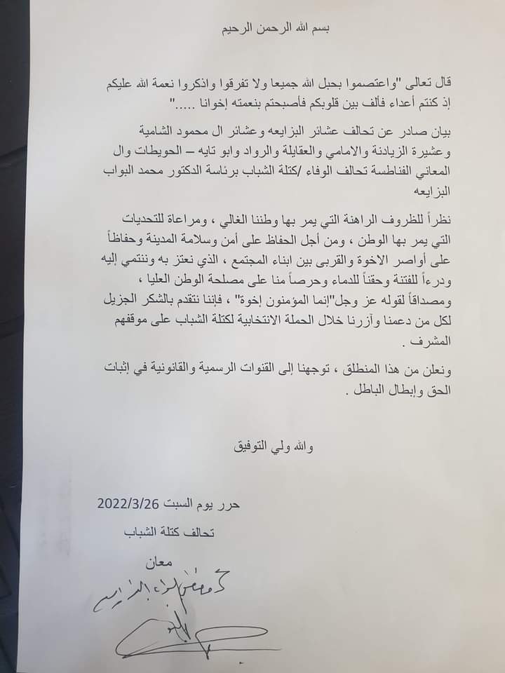 ومع الإحتفاظ بالحقوق القانونية للكتلة وذلك من خلال تشكيل لجنة مكونة من ٣٠عضواً ممثلاً لتكتل مستقبل معان برئاسة