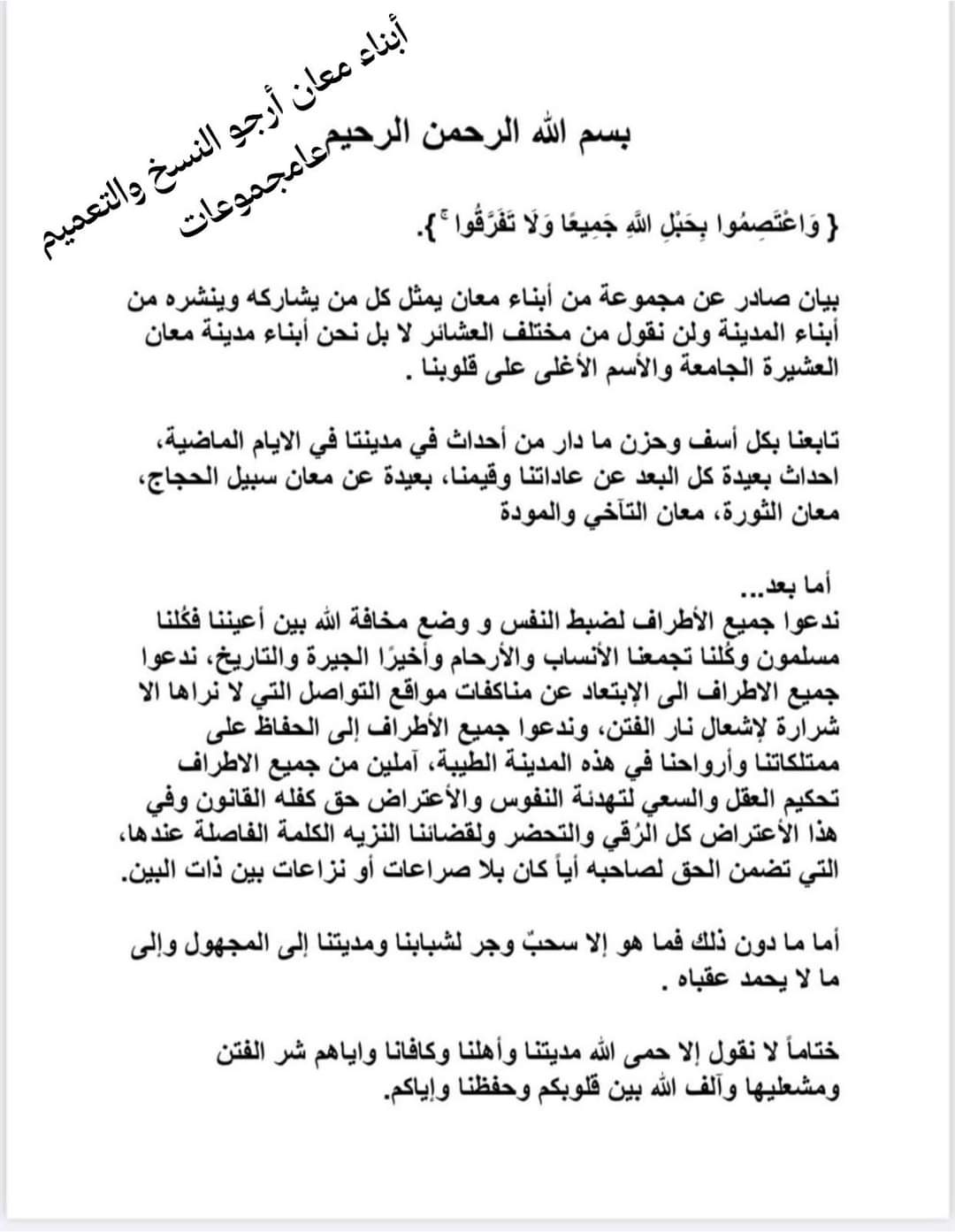 كما صدر في معان بيان يدعو إلى التهدئة وجاء فيه :