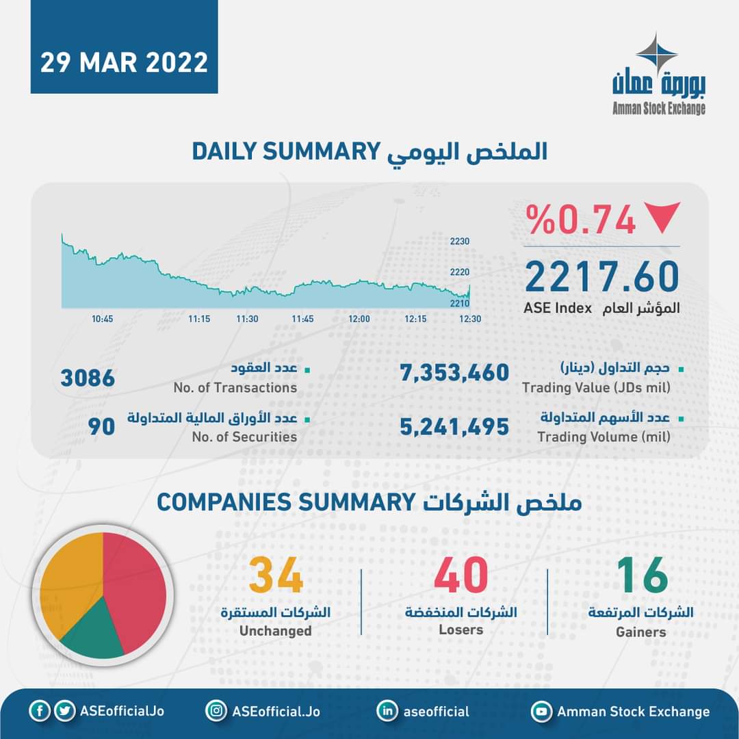 نبأ الأردن - بلغ حجم التداول الإجمالي ليوم الثلاثاء 29/03/2022 حوالي (7.4) مليون دينار وعدد الأسهم المتداولة (5.2) مليون سهم، نفذت من خلال (3,085) عقداً.