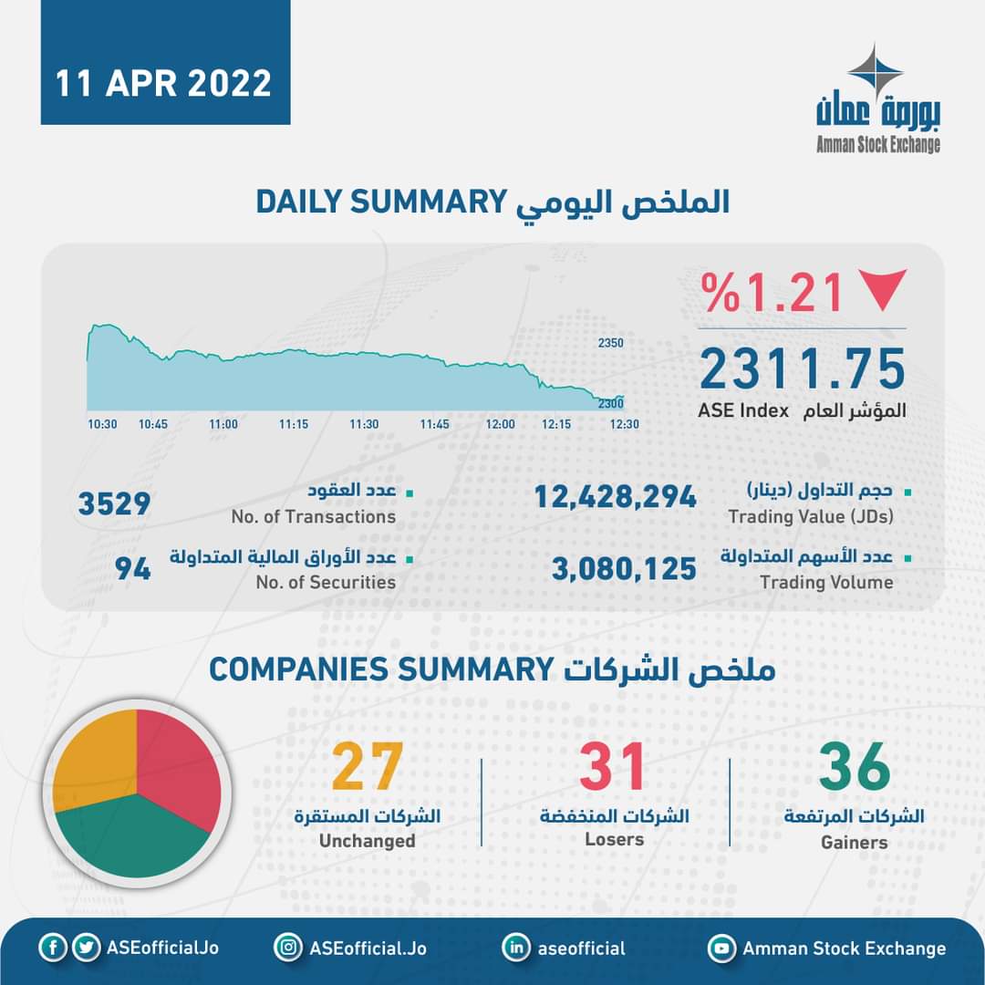 بلغ حجم التداول الإجمالي ليوم الاثنين 11/04/2022 حوالي (12.4) مليون دينار وعدد الأسهم المتداولة (3.1ز) مليون سهم، نفذت من خلال (3,529) عقداً.