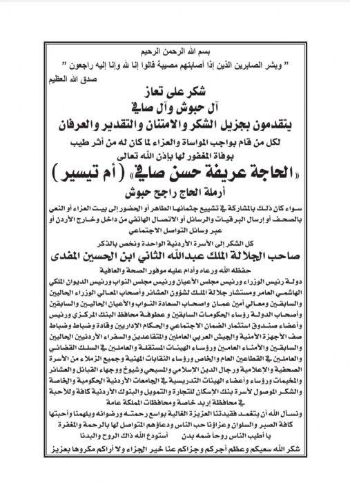 نبأ الأردن - شكر على تعاز من ال حبوش وال صافي بوفاه المرحومه الحاجه عريفه صافي والدة السيد ماهر حبوش
