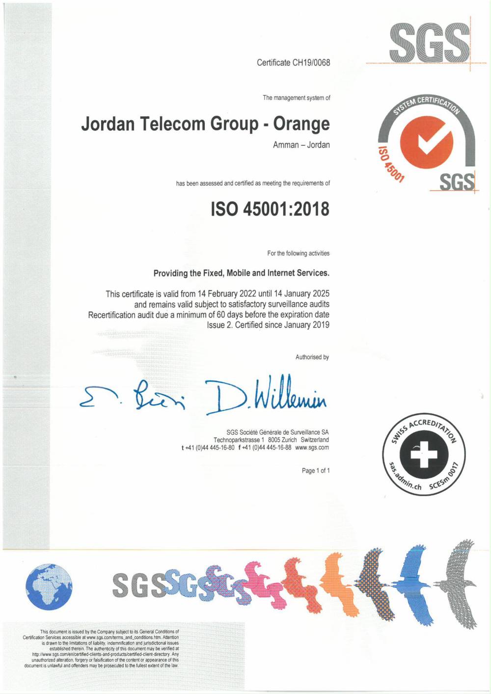 وبحسب بيان صحفي صادر عن الشركة، فقد وفرت أورنج الأردن لموظفيها بيئة عمل آمنة وصحية، من خلال الإجراءات التي تتخذها لمنع حصول أي إصابات ومحاولة تجنب الأمراض أو انتقال العدوى في كافة مواقع الشركة وتطويرها المستمر لأنظمة السلامة والصحة المهنية لمنع حدوث أي مفاجآت في هذا المجال، الأمر الذي أهلها للحصول على شهادة الأيزو لأنظمة إدارة السلامة والصحة المهنية.