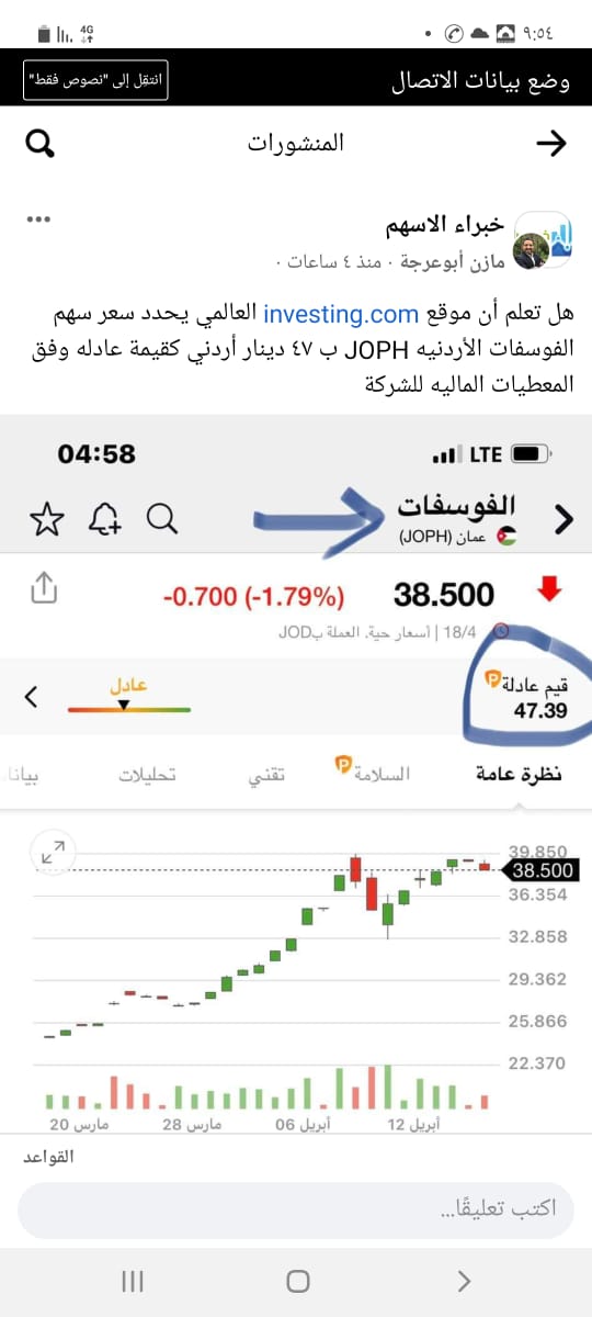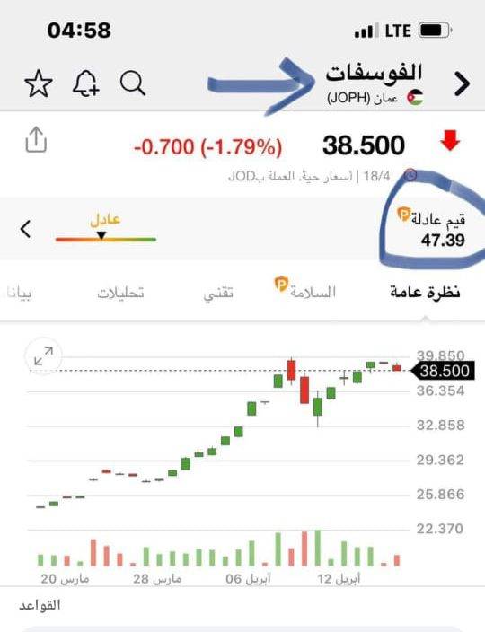 نبأ الأردن - حدد موقع investing.com المعروف في عالم البورصات، سعر سهم شركة الفوسفات الأردنية بـ 47 دينار، معتبراً أن هذا هو السعر العادل لسهم الشركة.