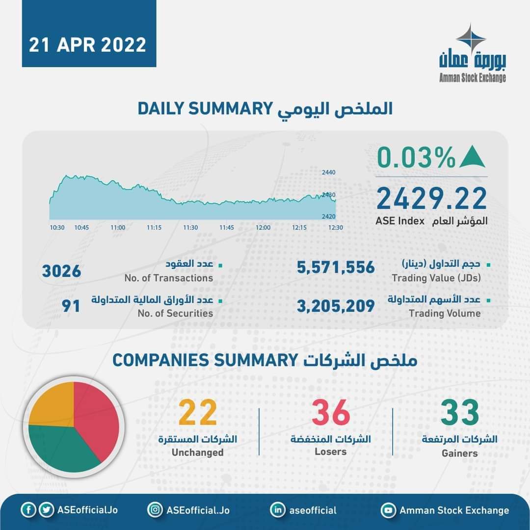 نبأ الأردن- بلغ حجم التداول الإجمالي ليوم الخميس 21/04/2022 حوالي (5.6) مليون دينار وعدد الأسهم المتداولة (3.2) مليون سهم، نفذت من خلال (3,024) عقداً.