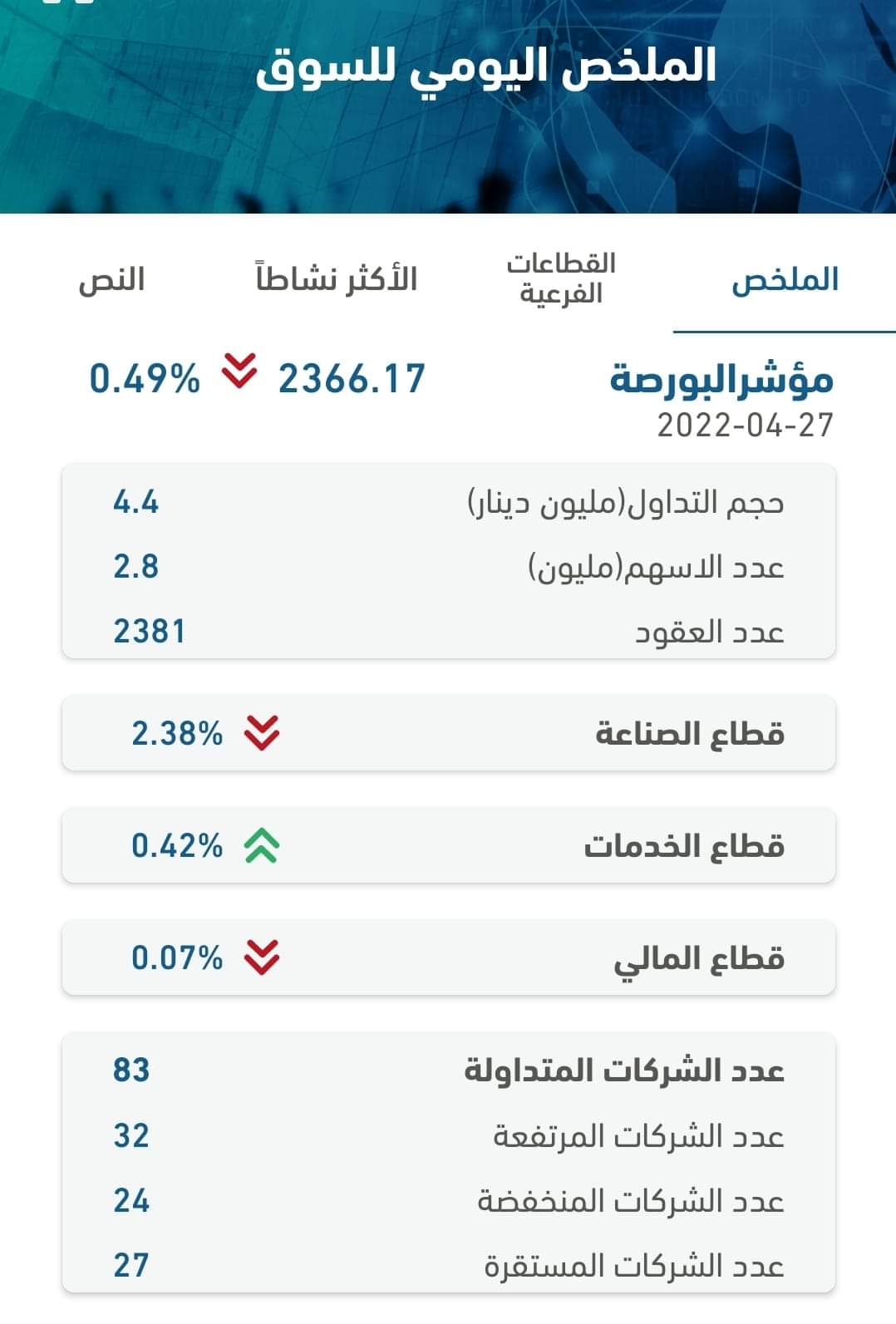 نبأ الأردن-بلغ حجم التداول الإجمالي ليوم الأربعاء 27/04/2022 حوالي (4.4) مليون دينار وعدد الأسهم المتداولة ( 8 . 2) مليون سهم، نفذت من خلال (2,381) عقداً.