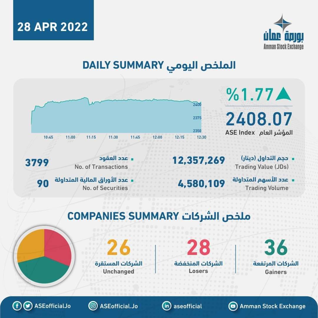 نبأ الأردن - بلغ حجم التداول الإجمالي ليوم الخميس 28/04/2022 حوالي (12.4) مليون دينار وعدد الأسهم المتداولة (4.6) مليون سهم، نفذت من خلال (3,799) عقداً.