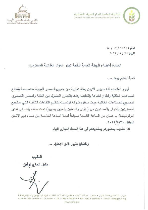 نبأ الأردن_ اعلنت النقابة العامة لتجار المواد الغذائية عن استضافتها لبعثة تجارية مصرية متخصصة بالصناعات الغذائية وقطاع الطباعة والتغليف مساء يوم الاثنين الموافق 30/5/2022 .