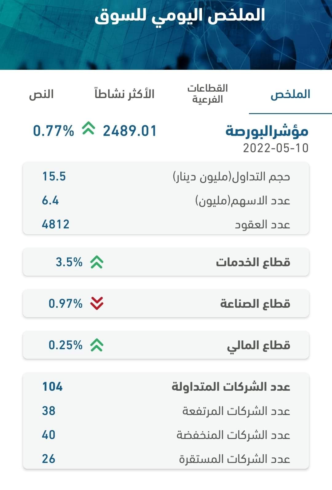 وعن مستويات الأسعار، فقد ارتفع الرقم القياسي العام لأسعار الأسهم لإغلاق هذا اليوم إلى (2489.01) نقطة، بارتفاع نسبته (0.77%).