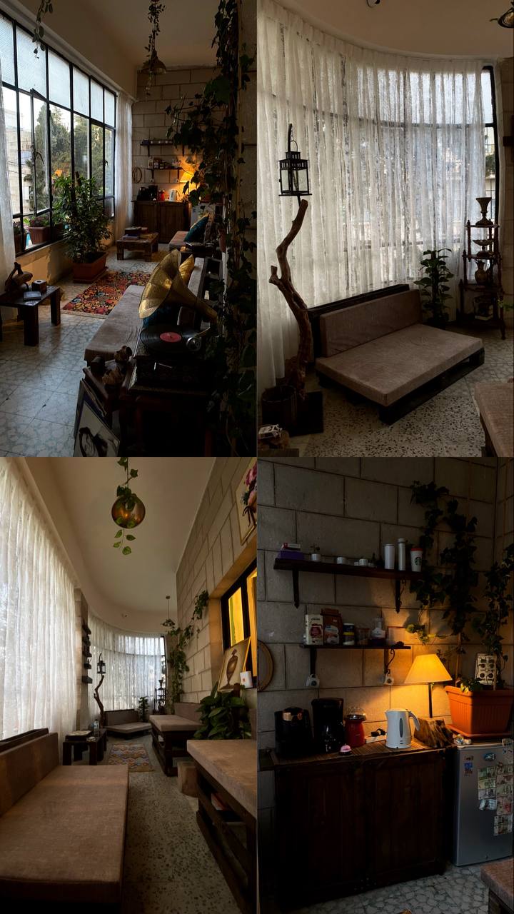 والحنين لبيوت الأجداد ففي البلكونة المزججة الممتلئة بالنباتات والفرش الخشبي المصنوع يدويا ومزينا بقطع النحاس والأنتيكات يمكن للزائر الجلوس والقراءة وشرب الشاي والقهوة التي يحضرها بنفسه مما يعطيه الإحساس بانه ببيت الجدود في اللويبدة.