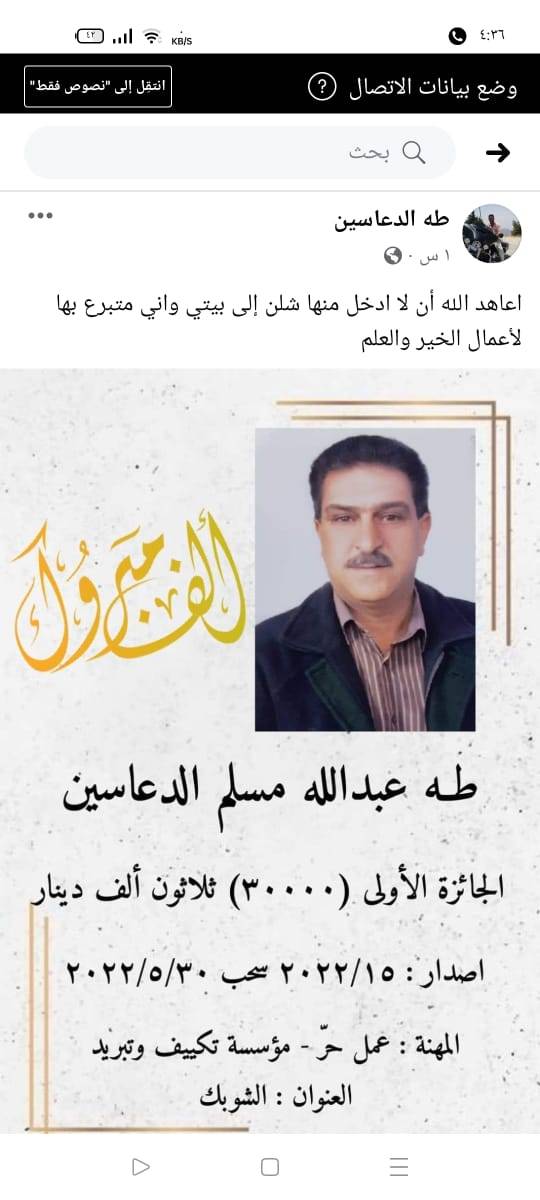 نبأ الأردن- تعهّد مواطن أردني، بالتبرع بكامل جائزة اليانصيب التي نالها والمقدرة بـ 30 ألف دينار للجمعيات الخيرية