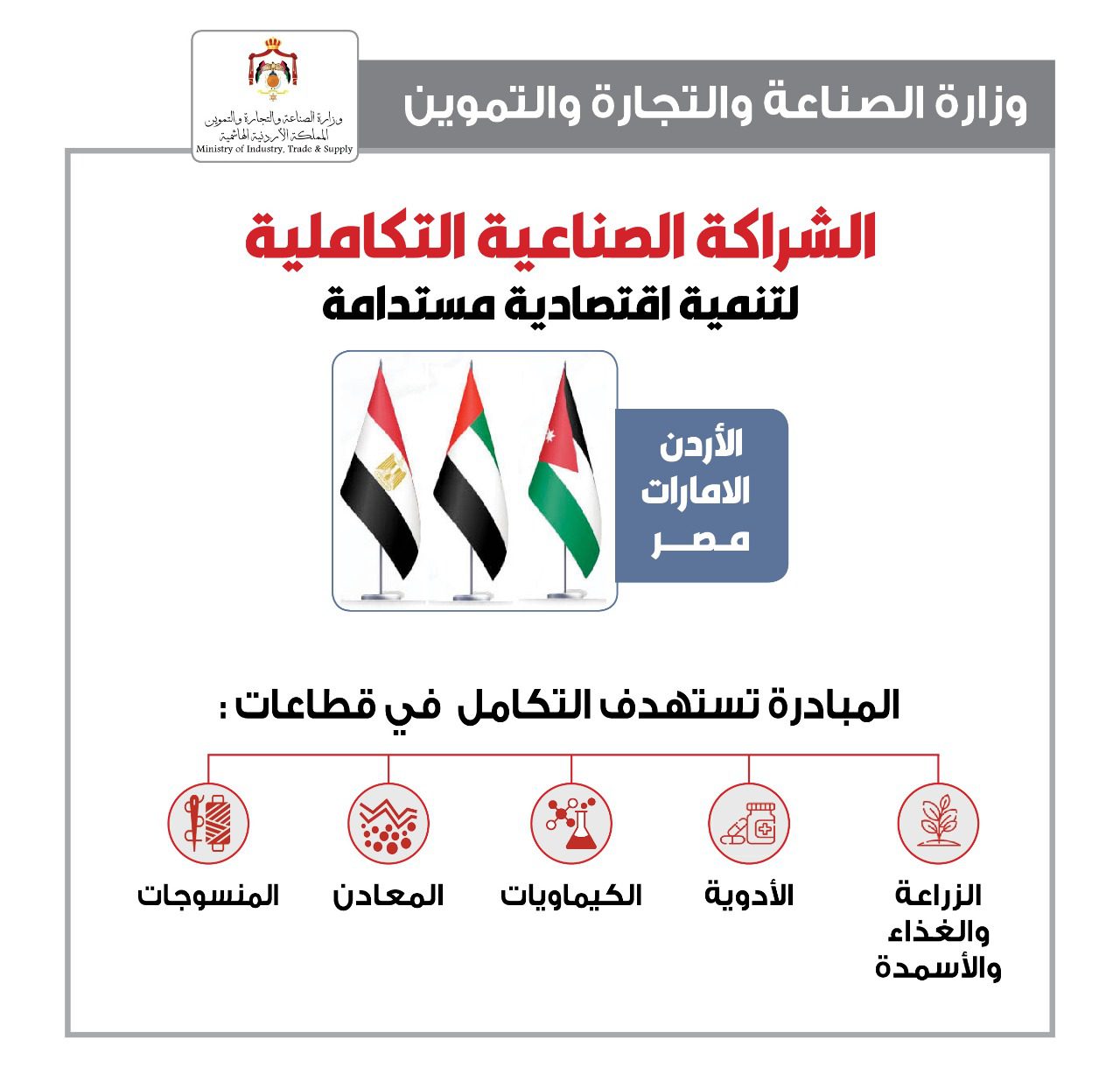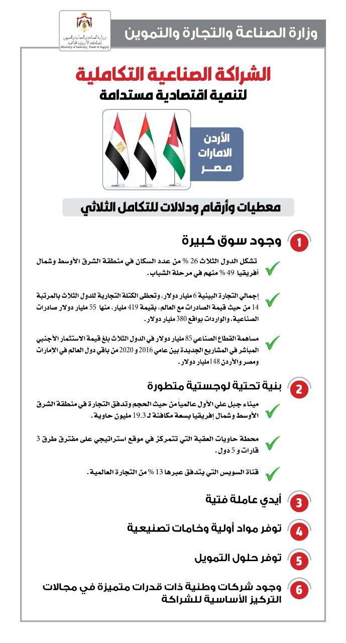 وقال : يبلغ إجمالي التجارة بين الدول الثلاث 6 مليار دولار وتحظى الكتلة التجارية للدول الثلاث بالمرتبة 14 من حيث قيمة الصادرات مع العالم بقيمة 419 مليار منها 55 مليار دولار الصادرات الصناعية والواردات بواقع 380 مليار دولار وتبلغ مساهمة القطاع الصناعي 85 مليار دولار في الدول الثلاث وبلغت قيمة الاستثمار الأجنبي المباشر في المشاريع الجديدة بين عامي 2016 و 2020 من باقي دول العالم في الإمارات ومصر والأردن 148مليار دولار.