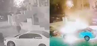 ووثقت كاميرا مراقبة ، قيام شخص بسكب مادة بترولية على المركبة ومن ثم أشعل النار ، وفر من المكان ، بعد إشتعال المركبة .