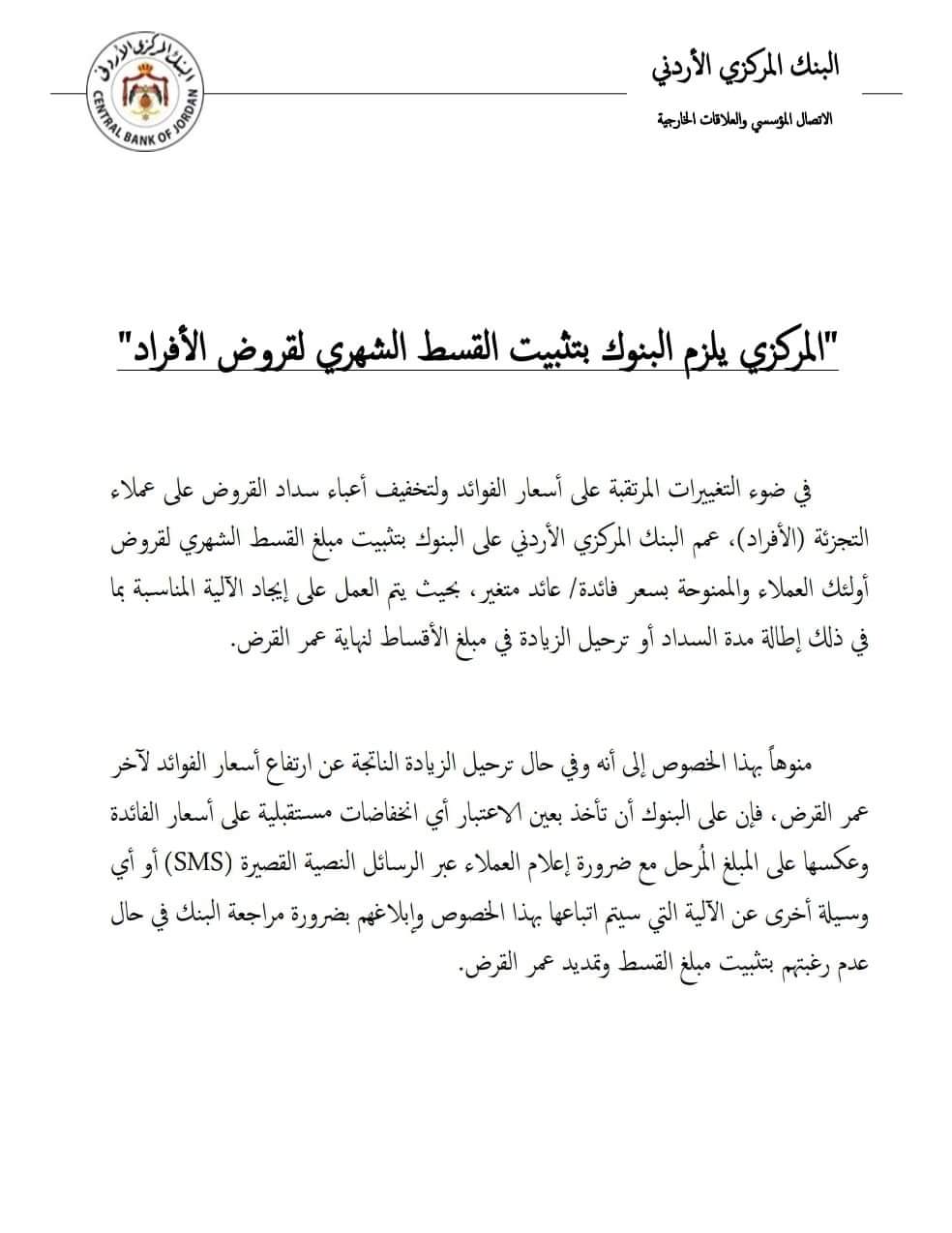 نبأ الأردن - أعلن البنك المركزي الأردني، رسمياً، إلزام، البنوك بتثبيت القسط الشهري لقروض الأفراد.