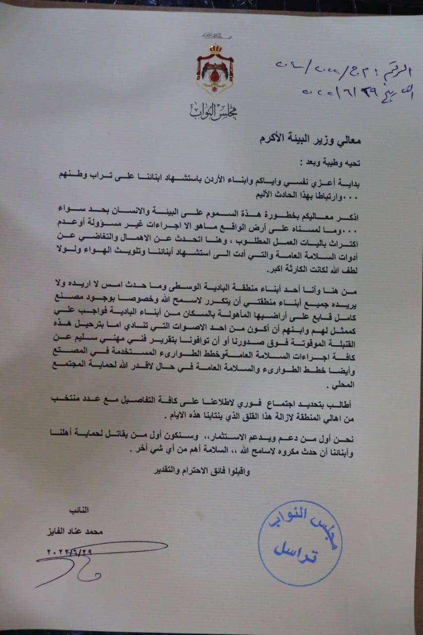 نبأ الأردن- وجه النائب محمد عناد الفايز كتاباً إلى وزير البيئة على وجه العجلة، معُرباً فيه عن استياءه الشديد اتجاه ماحَصل في حادثة العقبة، والتي نتج عنها اسشتهاد مجموعة من ابناء الوطن ،و قال إن ما حدث ليس إلا نتاج لعدم المسؤولية والإهمال الفادح في إجراءات السلامة العامة ، ولولا لطف الله لكانت كارثة أكبر .