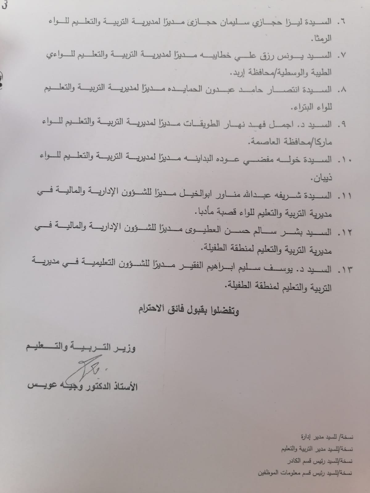 نبأ الأردن - أجرى وزير التربية والتعليم الدكتور وجيه عويس التشكيلات الادارية التالي في الوزارة :